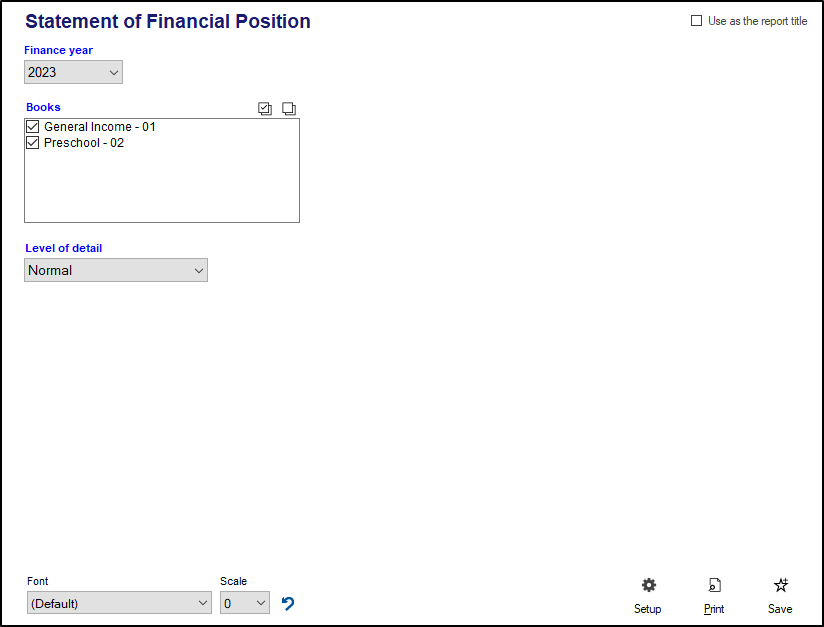 - You can choose which Book/Fund's accounts will be included on your report in the "Books" or "Funds" field by checking or unchecking the different books or funds you want to include.