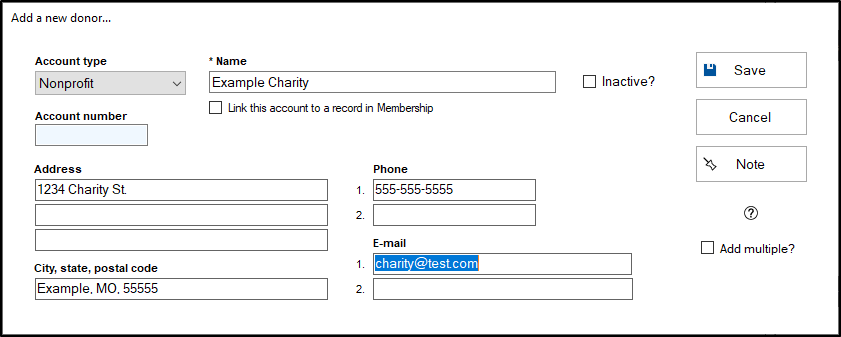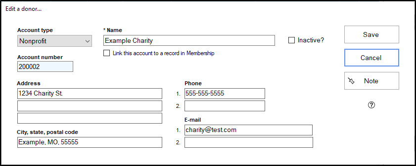 - Nonprofit - Can be linked to a non-household record from the Membership module that has been designated as a Church, School or Organization as its household type.