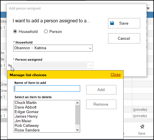 - In the Person Assigned field, select the Person Assigned you're adding to a person. You can add a new option by clicking in the drop down box for person assigned and clicking the "Add/Remove Item from the list" button that will appear to the left of the dropdown box.