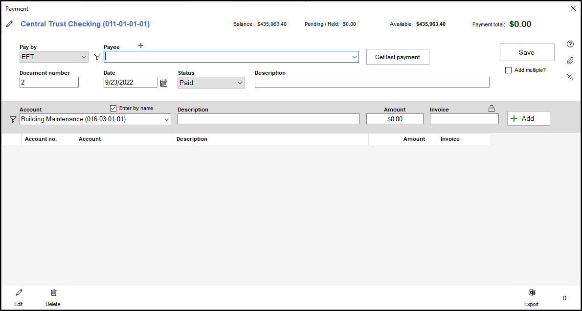 - Click the "Add" button to add a new payment. Choose the "EFT" option to create a new EFT payment.