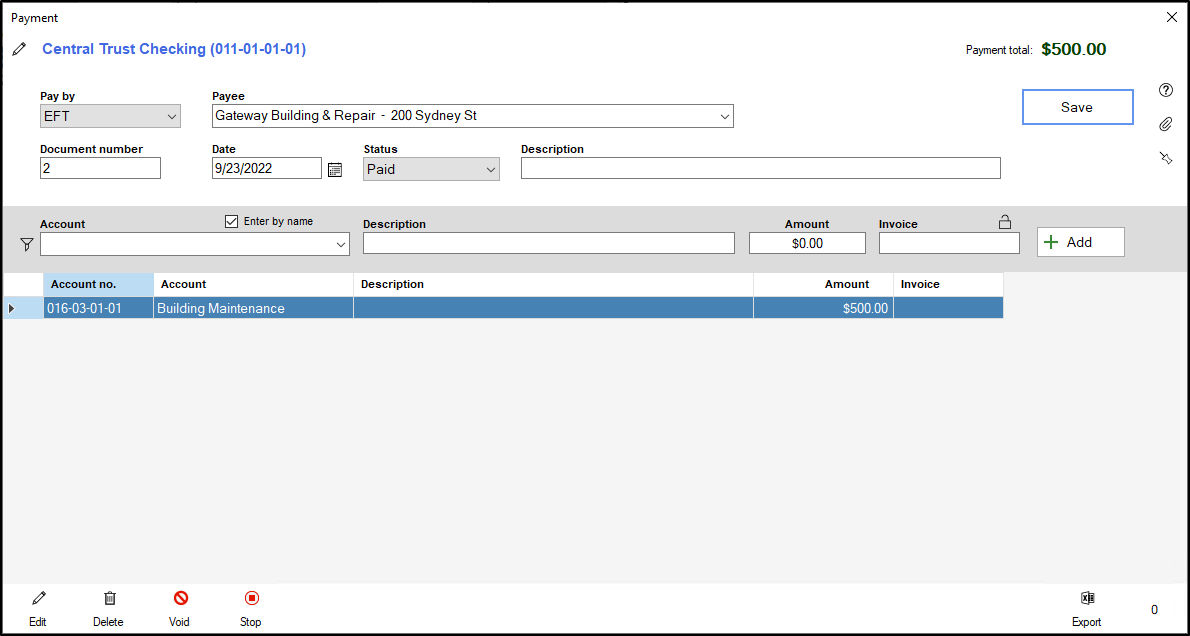 » Stop payment — Stopping an EFT Payment saves the details of the EFT Payment, and creates a reversing journal entry to provide an audit trail. The reversing journal entry that is created is dated with the current date.