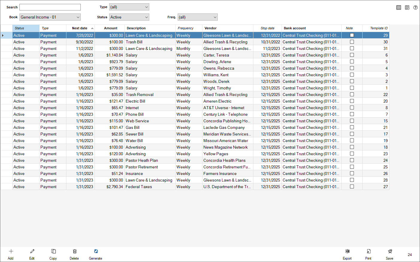 - There are options along the bottom of the grid to "Add", "Edit", "Copy", "Delete" and "Generate" your recurrent transactions.