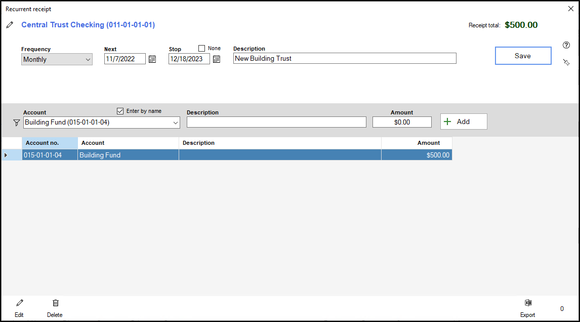 - The receipt window will appear, and you can make any changes you need to make to this receipt, including changing the frequency, the Next date, or the Stop date.