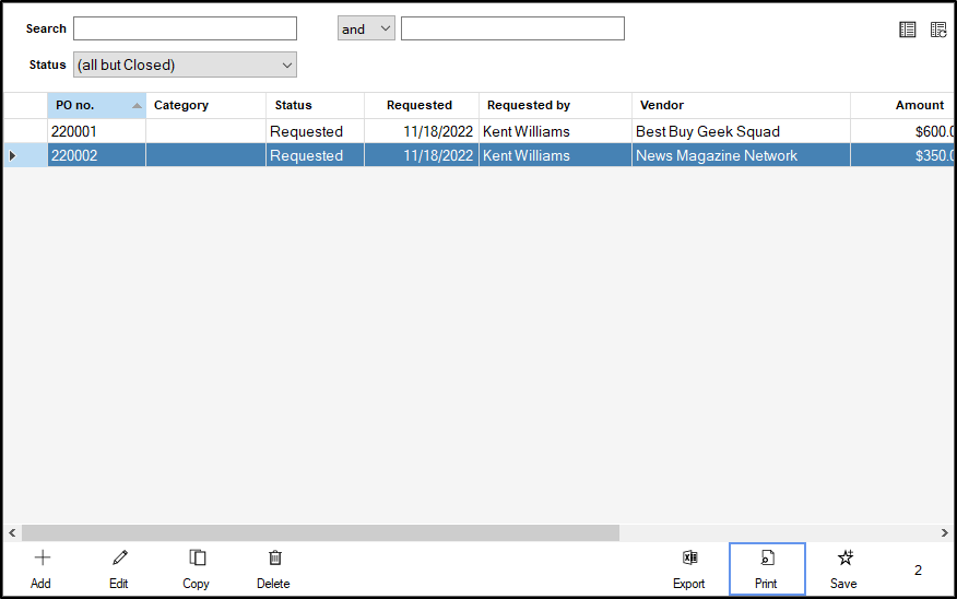 - You can Add, Edit, Copy, or Delete a Purchase Order by clicking the corresponding button at the bottom of the grid