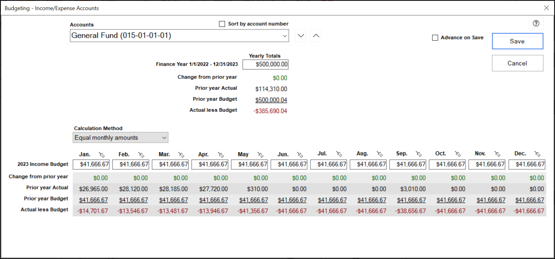 - If you want to continue to the next income account after saving the budget for this account, check the "Advance on Save" box.