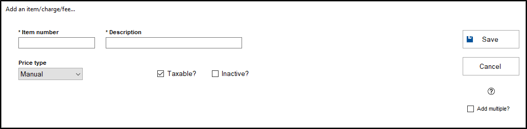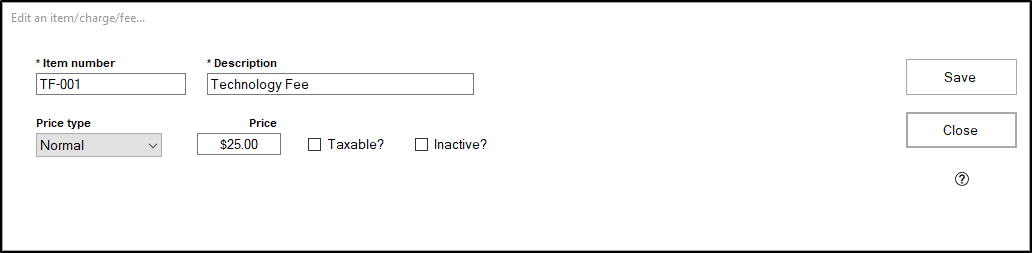 - There are two checkboxes you can check for the Item/Charge/Fee you're adding. "Taxable?" will allow tax to be applied to an item, and "Inactive?" will make it so this item is not active, and therefore, cannot be used in a transaction.