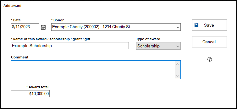 - The "Edit award" field will appear for the record you selected. Here, you can change any of the aspects of the award record, including Date, Donor, Name, Type of award, Comment, and Award total.