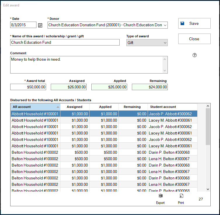 - The "Disbursed to the following AR Accounts / Students" grid will show each disbursement from this award, showing which AR account the award was distributed to, how much was assigned from the award, what portion of that disbursment has been applied to payments, how much of that disbursement is remaining, and what Student account it was applied to (if applicable). This grid can be exported or printed by using the "Export" and "Print" buttons respectively.