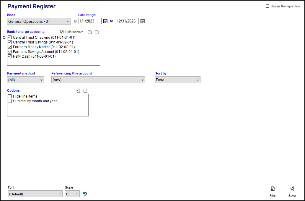 The Payment Register report provides you with a listing of all payments within a specified time period. You can filter this report in many different ways, including by Bank Account, Payment Method, or if a payment references a specific account. This report can be helpful to provide a detailed record of payments that occurred over a specified period of time.