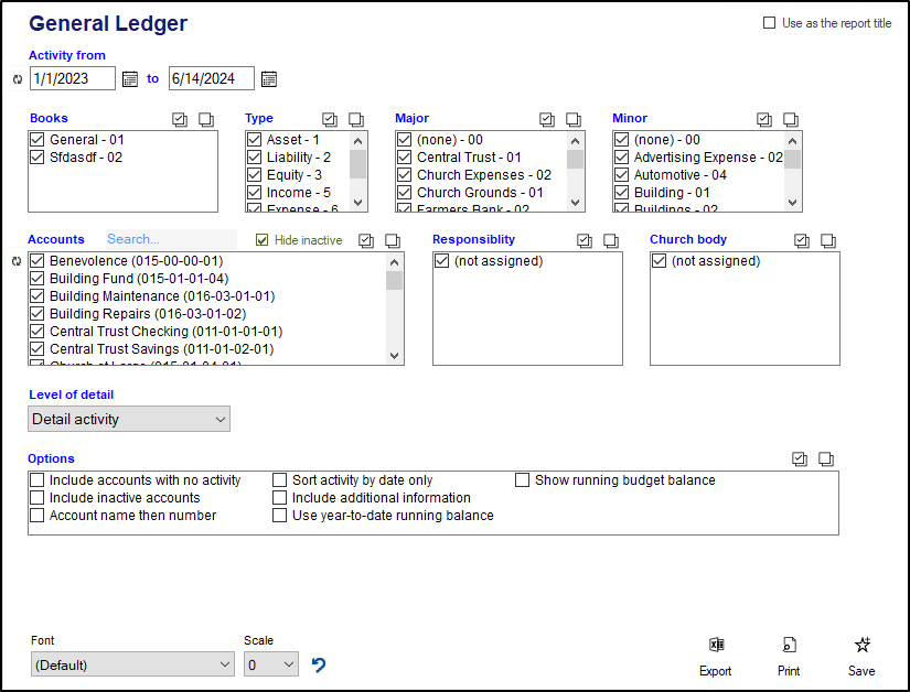 - Next you can filter which accounts you want to see by using the various filter fields. Each of these fields will have options that you can check or uncheck to include or exclude particular sets of accounts. These fields include "Book", "Type", "Major", "Minor", "Responsibility" and "Church Body". You can also pick and choose specific accounts you want to include or exclude in the "Account" field.